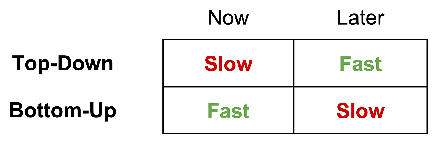 Both are valid and useful approaches to team building with obvious trade offs. The most important difference in the two approaches is whether you want to grow faster right now, or grow faster in the future. It’s much easier and faster to hire individual contributors, so a Bottom-Up approach will produce much faster results. However, when you need to bring a leader in later there is a strong chance for disruption as the leader will have different ideas and the team might struggle to adapt. Someone always leaves when a new leader comes in, it’s unavoidable. As a result, you will grow slower in the future as you adjust to the new leadership and make changes among the individual contributors.