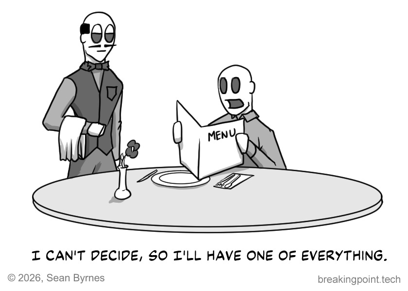 You can almost see the rationale. Given a few options and no clearly obvious winner, try to do everything until it’s clear what is working and what is not. Then, prune the losers, keep the winner and the decision is made for you. It almost makes sense.